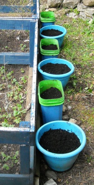 Into the smaller pots I have planted, from bottom to top (so I’ll remember): hummingbird-friendly, butterfly-friendly and bee-friendly wildflower seeds.