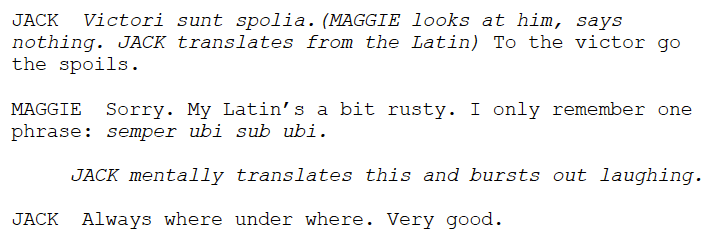 In the second half of An Unhelpful Complication Jack spouts Latin a couple of times and Maggie responds with an attempt at humour to lighten things up.