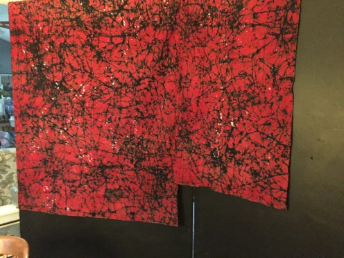 The director felt the view of my front room when Lucy is zooming in could be improved and I agreed. Something red, he said. Before he’d finished making the suggestion I knew exactly what I would use: What was left (after making a tablecloth) of the fabulous fabric I bought in the market in Abuja in 2006.