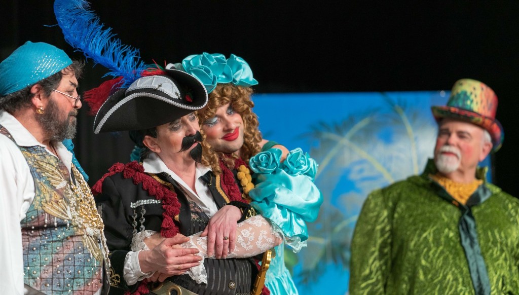 The following year’s panto, Pirates of Nursery Rhyme Island, was written and directed by a local author. I went to the auditions, requesting to be cast in a small role. When the director called me back, she wanted me to play the villain, Captain Jack Budgie. I balked at the number of lines to learn. She begged. I agreed. Half of Captain Jack’s speeches consisted of nautical gobbledygook. Not being a sailor, I found these speeches particularly challenging. (Not sure I made it through a single performance without having to call for a line.)