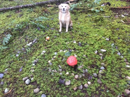 Someone at some point painted a rock to look like a toadstool and surrounded it with a maze of smaller rocks. The moss has taken over quite a bit, so it isn’t easy to see quite how delightfully whimsical this is. (Georgie, who it’s difficult to get to sit still for more than a couple of seconds, couldn’t care less about the fairy ring. She’s only interested in the ball and when someone is going to throw it for her.)