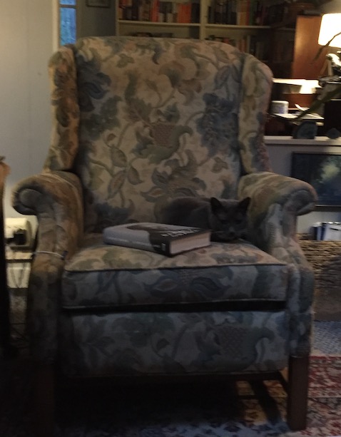 It’s been a while since I’ve sat in this chair – even longer since Stella has. How did she know? Was it simply seeing me put the book on the chair? How does that work? Bit of a huff from her when I claimed the chair, although she did return eventually to stretch out on my legs. (Yes, the chair reclines.)