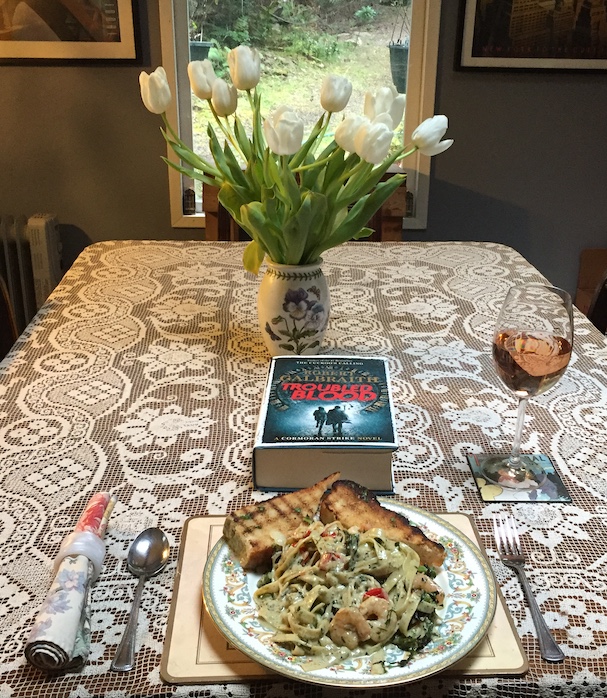 Every week for the past several weeks, I’ve been posting a “Sunday dinner with” pic on Twitter. This week it was Sunday dinner with Robert Galbraith (aka J K Rowling).
