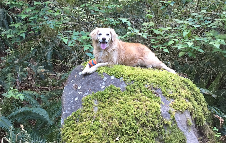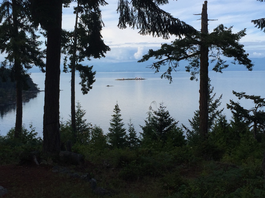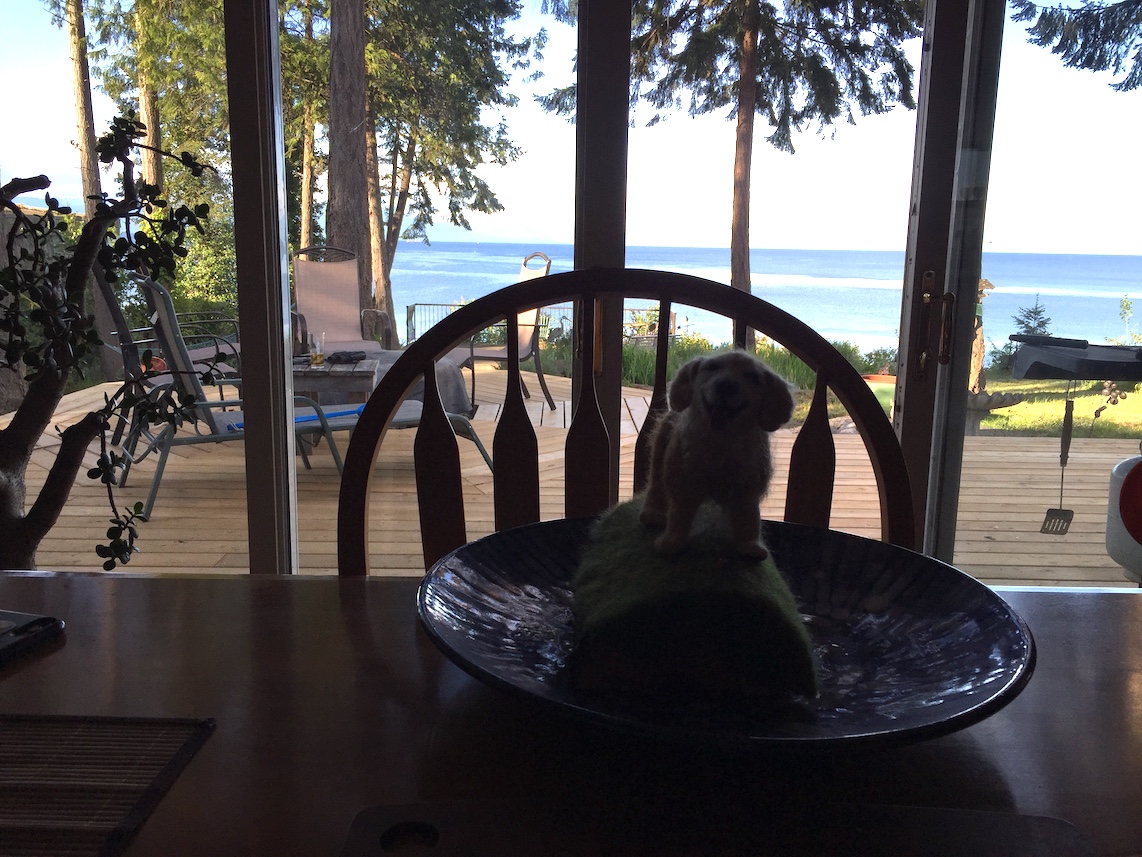 Back outside on the deck after dinner for some backyard ball throwing for Georgie. You can’t actually see the sun set from Joe’s place, but there is a wonderful pink glow on the water.