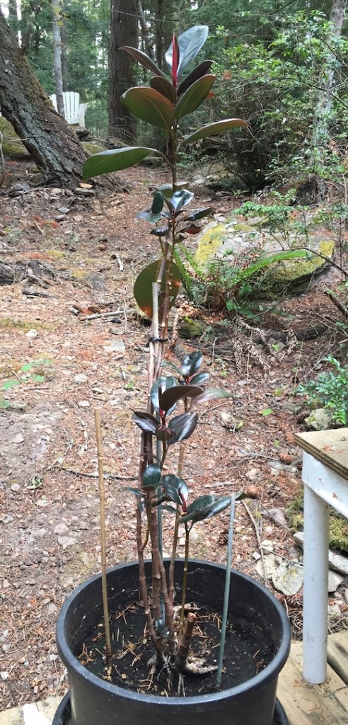 I did a foolish thing last year. I moved my large rubber plant from one corner of the diningroom to another corner. The new corner doesn’t get as much light – very little light indeed. By the spring the rubber plant had lost a lot of leaves and was looking near death. It’s in a big pot, which could have been useful for something else, but I couldn’t quite yank it out and toss it.