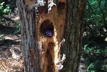 Shortly after I took this photo I ran into a group coming the other way: a young girl, her mother and her grandmother. (I heard them before I saw them. They’d been walking through the woods singing, which was really quite sweet.) I asked if they’d seen any ladybirds. The mother said she’d seen one, but they really hadn’t been looking for others. Were there more, she asked. I pulled out my phone and started showing them the pictures. The little girl asked if she could see, too. I bent over to show her. “Ooh,” she said when I got to the photo above, “purple is my favourite colour.” I told them where to find the purple one. “Oh, look,” the mother said, pointing low to the ground, “there’s another one.”