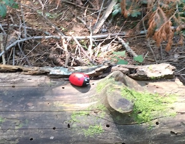 Shortly after I took this photo I ran into a group coming the other way: a young girl, her mother and her grandmother. (I heard them before I saw them. They’d been walking through the woods singing, which was really quite sweet.) I asked if they’d seen any ladybirds. The mother said she’d seen one, but they really hadn’t been looking for others. Were there more, she asked. I pulled out my phone and started showing them the pictures. The little girl asked if she could see, too. I bent over to show her. “Ooh,” she said when I got to the photo above, “purple is my favourite colour.” I told them where to find the purple one. “Oh, look,” the mother said, pointing low to the ground, “there’s another one.”
