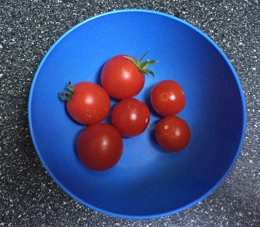 These are the tomatoes from my garden. Not even enough for one serving of prawns and pasta, which Catherine has requested for a dinner while she’s here. Ergo a trip to the farmers’ market on Saturday to supplement.