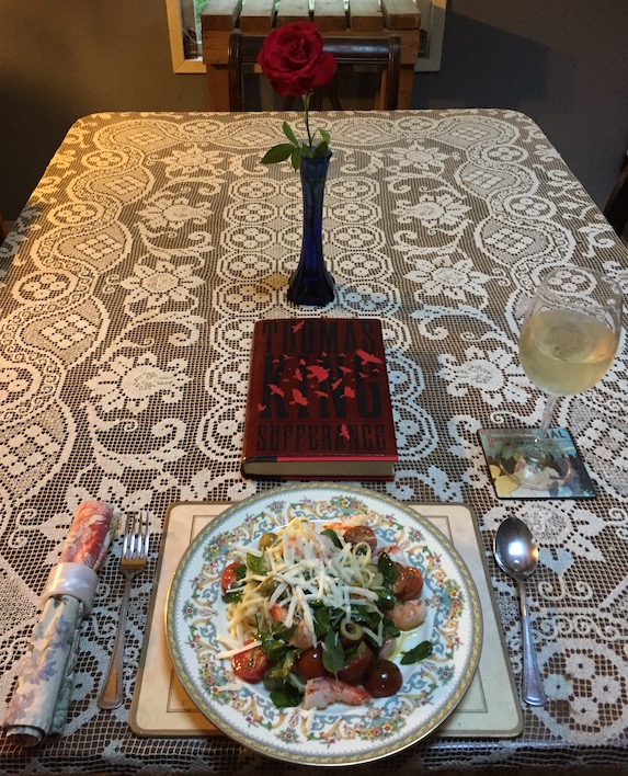 Catherine may live in the interior now, but in her heart she is an ocean woman. Thus, in part, her willingness to travel so far to visit me on the coast. I’m not saying my diningroom isn’t perfectly pleasant or my deck, but neither has a water view, which I knew she would appreciate for her last evening here. Fortunately I know someone whose view is going begging at the moment. A quick check with Joe in Winnipeg confirmed that we were welcome to use his deck.