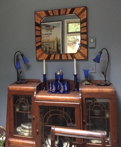 Oh, my god, so art deco! Oh, my god, I had to have it. Ted, the wood crafter, actually let me take it home with me to see how it would look in the spot I had in mind. I left with the mirror and a promise that I would either bring it back the next day or return with payment. I hung it above the sideboard and of course it’s absolutely perfect.