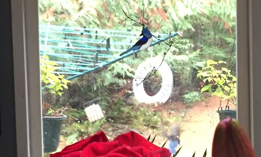 Unfortunately I wasn’t quick enough with the camera to catch this one. The blue blur at the bottom is him flying away with a peanut in his mouth.