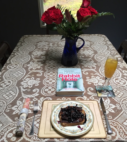Too much of a faff to do Eggs Benny just for me, so I went for French toast with blueberry and maple syrup sauce, along with a (non-alcoholic) Buck’s Fizz. Before you ask, the roses are a present from me to me. (Who the hell else was going to buy me roses?)