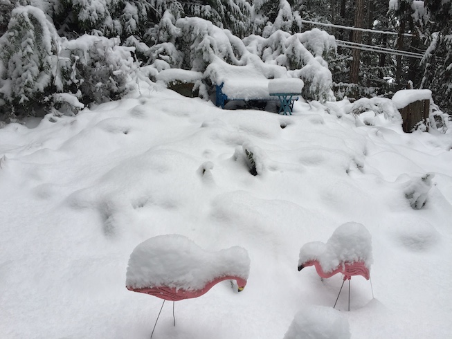 It’s going nowhere until the snow melts. I had a mild panic attack just driving back from the post boxes on Christmas Eve, thanks to the asshole who sent me spiralling off the road in a blizzard five years ago. And that was before we got to a foot of snow. I have a woodstove, food in the fridge and freezer and a generator.