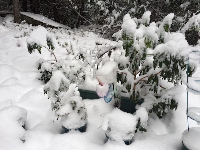 After taking these photos yesterday did my daily job of shaking as much snow off the rhodos as I could. I suspect the ones that aren’t already staked due to previous dumps of snow will now need to be. I can’t see them bouncing back without help. The leaves are brittle, frozen. No doubt the dozens and dozens of flower buds are also frozen.