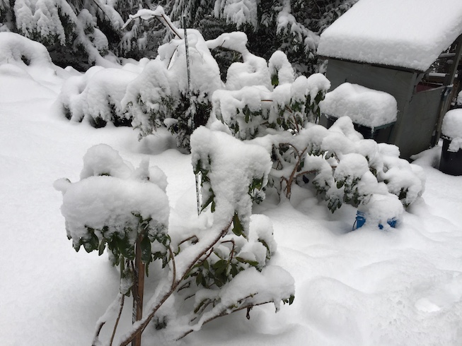 After taking these photos yesterday did my daily job of shaking as much snow off the rhodos as I could. I suspect the ones that aren’t already staked due to previous dumps of snow will now need to be. I can’t see them bouncing back without help. The leaves are brittle, frozen. No doubt the dozens and dozens of flower buds are also frozen.