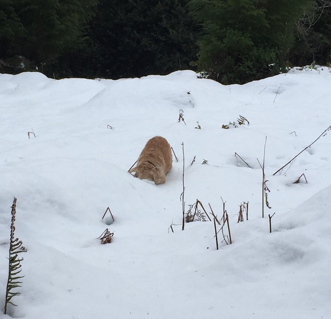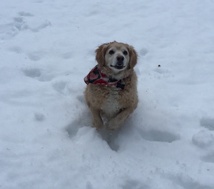 So, no ball hurling for her yesterday. Fine with Georgie. After a few minutes of confusion, wondering when the ball was going to appear, she happily started bounding through the snow (if stupid WordPress would still let me insert videos, you could see), rolling in it, sticking her face in…