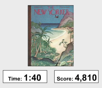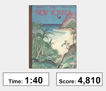 As I believe I may have mentioned, in my efforts to wean myself off Freecell I took up Guardian crosswords and New Yorker cover jigsaw puzzles. During last week’s stupid week, these online jigsaws became my new addiction, filling up the stupid days.