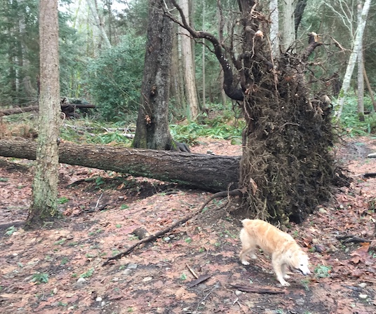 Signs of snow damage are everywhere with trees of all sizes felled by the weight in the woods and across the paths.