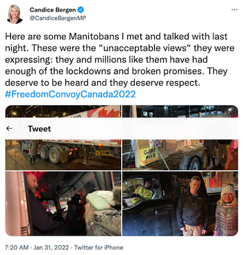 And what do we know about her? In the week before her election as leader, her Twitter account was all pro Freedumb Convoy all the time. Three days before she became leader she was tweeting photos of herself and the “protesters”.