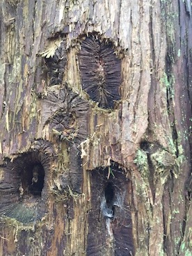 On an early walk we came across what we dubbed the “woodpecker condo”, as it had so many rectangular holes pecked into it. But this is what closer inspection revealed.