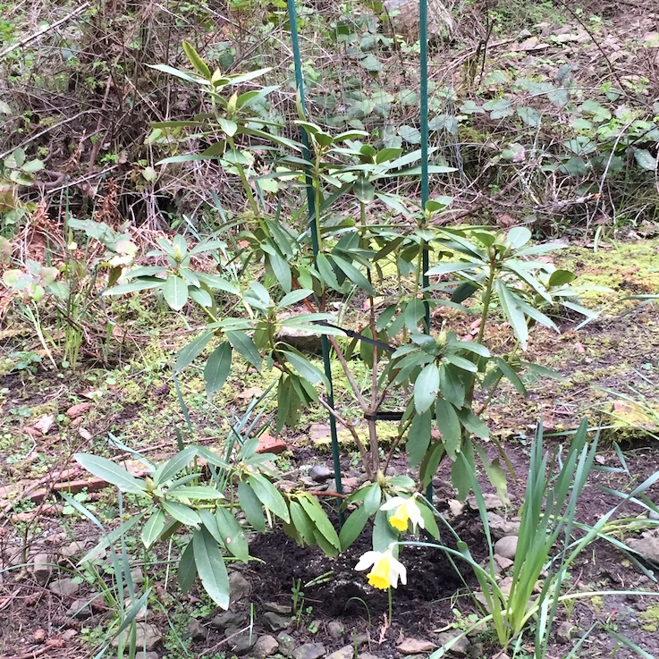 For the second rhodo I asked Dave to find one known for its lovely scent. He assured me the one he bought does. Unfortunately I cannot attest to this as it’s never flowered. Nor can I remember what colour the flowers are supposed to be, but I’m going to find out this year, because there are at least a dozen flower buds.