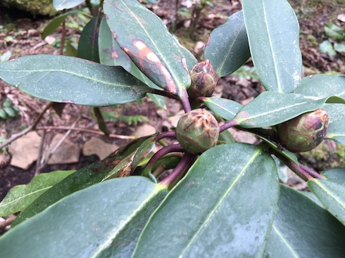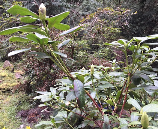 These are the original two, planted at the back of the house after I learnt that deer don’t eat rhodos. The one on the right has deep pink flowers. For the past few years I’ve been lucky to see one or two. This year there are going to be nearly twenty!