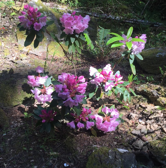Some years ago, when he was going to a specialty nursery on Vancouver Island, Rhodo Dave picked up two new rhododendrons for me. One, a purple one which I’d asked for, has flowered fairly well since then. For the other I asked for one with a nice scent, which not many rhodos have. I made a point of planting it near the deck so I could enjoy the scent. Since then it’s grown quite a bit, but until this year has never produced a flower.