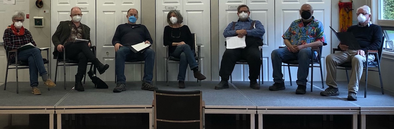 The decision to return to live-in-theatre performances was not taken lightly, but, as one director said, “If not now, when?” It hasn’t gone without hitch, I’m sorry to say. We started out rehearsing without masks (air filter on, windows and doors open) and one fateful Sunday one of the cast members, unaware that he’d been infected with Covid, managed to infect three others, one of whom has had an extremely hard time of it.