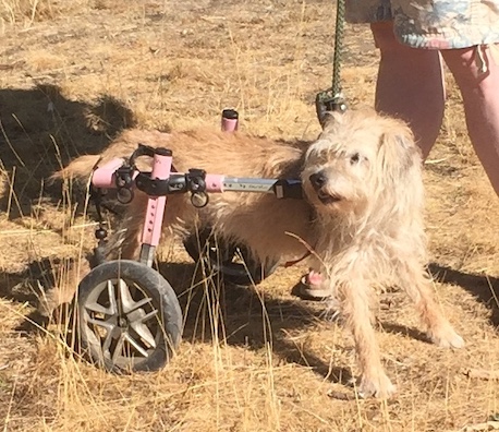 Gidget, bless her, manages to get around a treat in her little canine wheel chair.