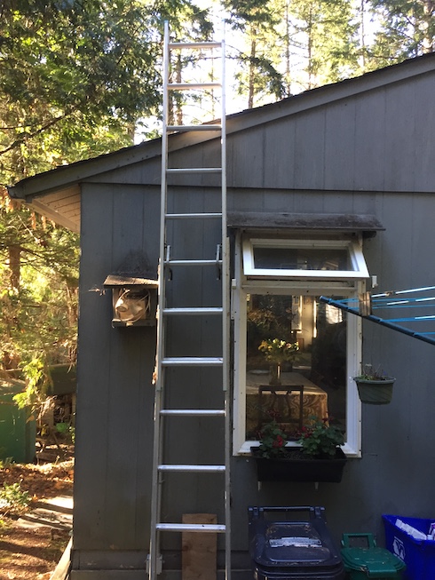 As I have previously explained, this used to be easy peasy when we had an 18 foot ladder, which meant I could lean it against the back of the house at a safe angle and still have four feet to spare at the top, so I could just walk off the ladder onto the roof. No problemo. Then the ladder disappeared and the person who replaced it for us when they were in town bought a 16 foot ladder. Not so easy peasy. In order to have any extra space at the roof it cannot be placed at a really safe angle.