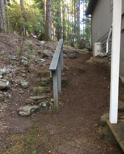 I started clearing the fir needles and cones from the side of the house before I left for the UK in August. Managed to get more than half the job done, then ran out of steam. A half-filled bin has been sitting at the bottom of the steps ever since. Then last month I got around to sweeping the needles and cones off the roof and cleaned out the gutters, leaving yet more debris at the side of the house.