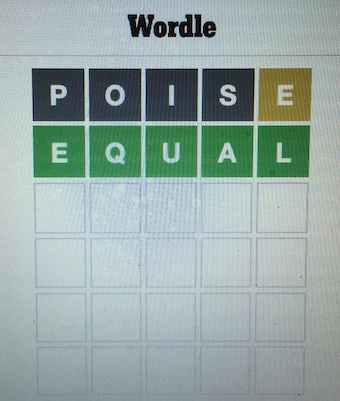 First word I used yesterday was POISE. You know, same deal, three vowels, only one of which (in the wrong place) was in the answer. Okay, could I think of a word that included the correct vowel and also used the other two? Yes, I could. Throwaway guess, as one of the consonants is hardly ever used, just to see which vowel was missing from the answer.