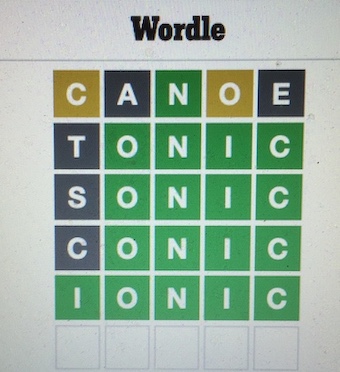 Oh, and look what it got me – three letters, one in the right place. Only one vowel, though, so let’s try something that fits with a different vowel. Oh, so close! Well, if it’s not TONIC, it must be SONIC. What?!?! Hmm. Start going through consonants in my head. Okay, conical is a word, so perhaps CONIC is, too. No? Grr. Go through every other consonant. Nope. There is no other possible word. What the fuck? Decide to phone a friend. Donna’s already posted her successful score. Let’s try her. I don’t necessarily want the answer. I just want to know if there is actually one other ONIC word. Donna’s not home, so I explain my predicament to her husband (who doesn’t do Wordle). He doesn’t say yes, he can think of another word. He just says the word: IONIC. Isn’t that a proper name, I ask. No, he assures me. I type it in. Well, fuck me, he’s right. I can’t lay claim to success when I post the score on the island Wordle Facebook group page. I confess I had help.