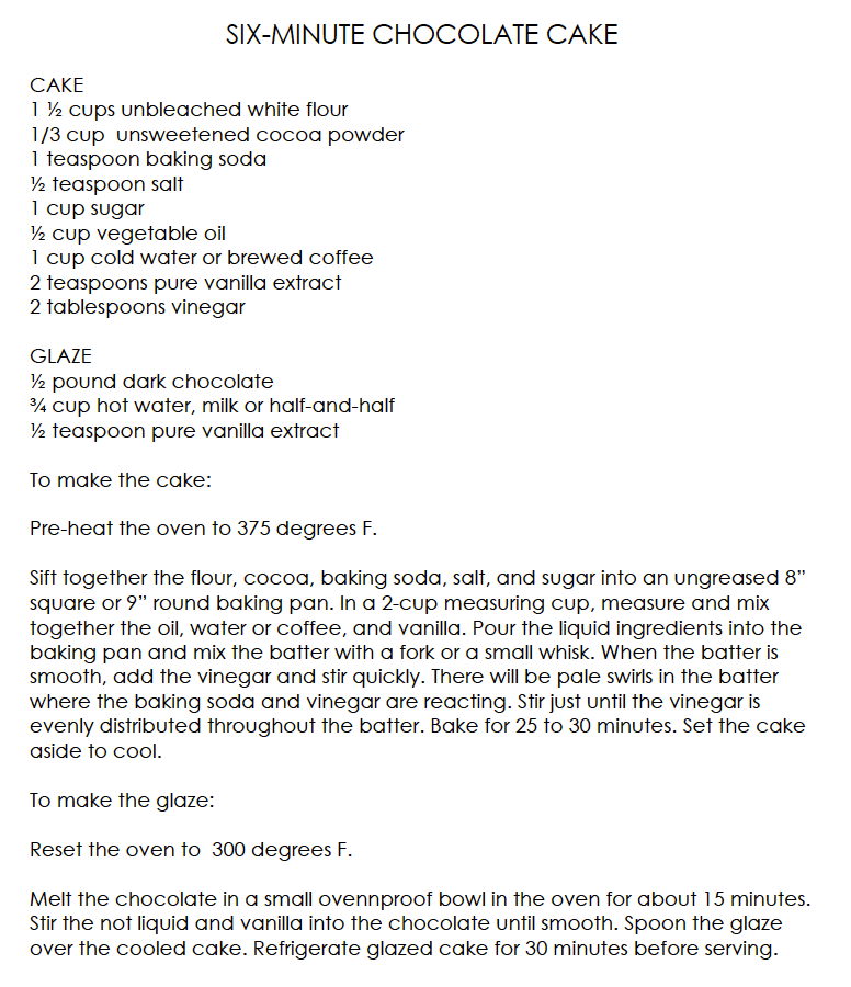 This is a famous cake. My friend Jane knows it well, as it was in the Moosewood cookbook she sold to me many years ago when she had her bookshop in Vancouver. Called “Six-Minute Chocolate Cake”, it really is the easiest cake recipe in the world.