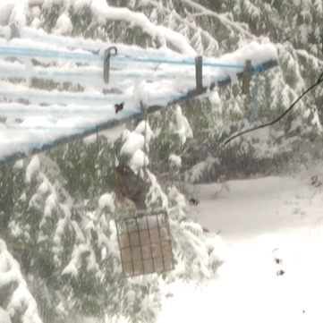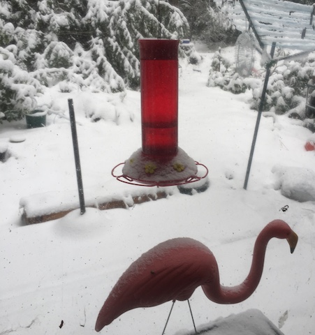 Bring in hummingbird feeder to thaw out. Fortunately the suet feeder is still available for the other birds.