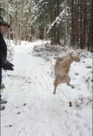 This is a screen grab from a short video I took of Georgie leaping in the air to successfully catch a snowball in her mouth – then wonder where the hell it went. The video is really funny, but, alas and again, WordPress won’t let me paste in videos.