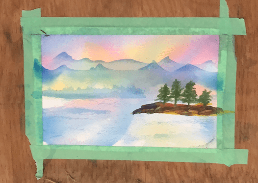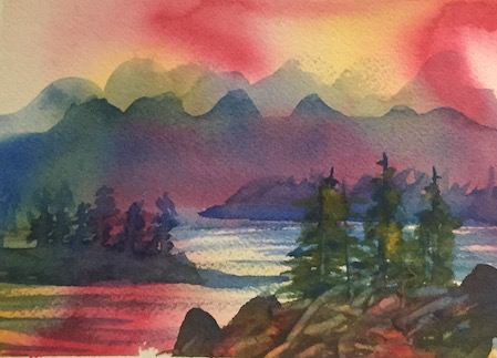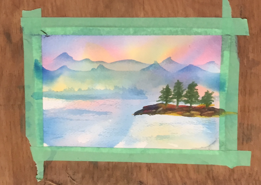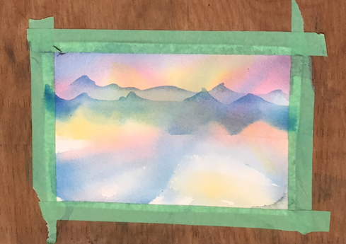 Second step: Decide which half you want to be the sky, then wet a strip and add mountains. Dry paper.