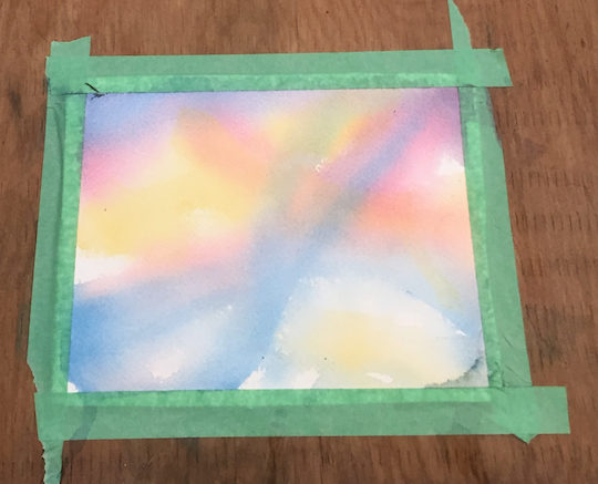 First step: Thoroughly wet paper, then, closing your eyes as you do so, add three random brush strokes each of yellow, red and blue. Use blow dryer to dry paper.