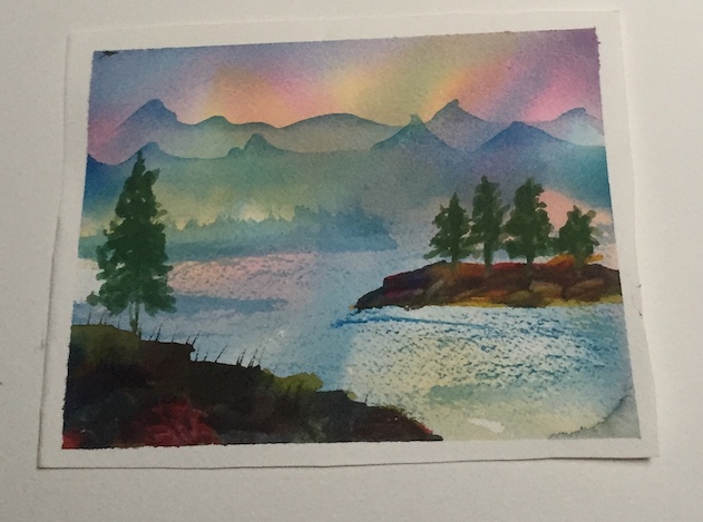 If the trees from the original look better (do they?), that’s because the instructor improved on my feeble efforts. The ones from yesterday are all mine, which makes for a more satisfying painting.