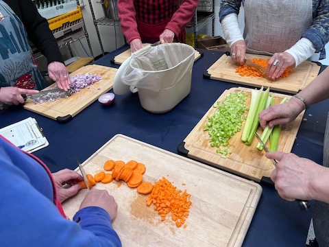 That’s me on the onions, looking on as others manage impressively small dicing of carrots and celery.
