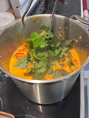 And it was fun. Three women I’ve at least met before, five whom I haven’t. A laughter-filled late (for some) morning of chopping and chatting. On yesterday’s menu: red lentil soup with nettles instead of spinach. (One of the group members is a nettle aficionado.)