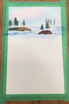 Next join up water and add rocks on the cliff edge and land in the foreground. The instructor suggested adding a little man fishing and demonstrated how to “easily” do so. Like the last time it looked like something that could easily go very badly awry, so (like the last time) I opted instead to add a tree in the foreground.