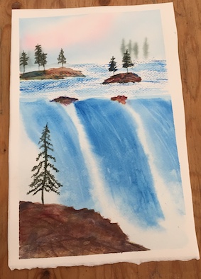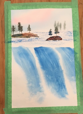If I’m being honest, I think I did a better job on the actual waterfall and cliff rocks the first time (on the left). But I do think today’s trees are better. Also, glad I decided to buck the instruction then and today to use yellow in the sky and use pink instead.