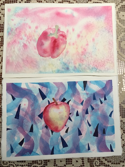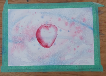 When paper is completely dry, scrape off salt, then wet the area inside the outline and fill in apple.