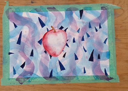 Next step, wet paper and (avoiding the inside of the apple outline) add swirls and splotches. Then a surprise ingredient: liberally sprinkle salt on still-wet paper.