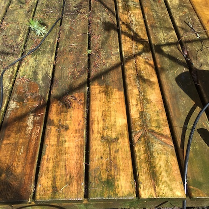 An hour later, despite wearing wellies, my jeans are soaked, but the deck has been mostly deslimed.