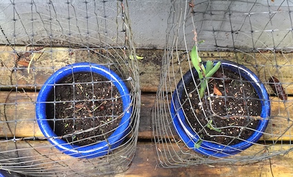 Or rather, lack of same. I planted ten bulbs in these two pots last autumn. And I put the pots in “cages” to protect them from the deer. Two sad sets of leaves, which seem unlikely to produce a flower, in one pot, none in the other. Humph.