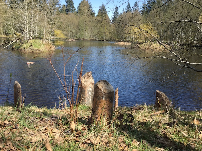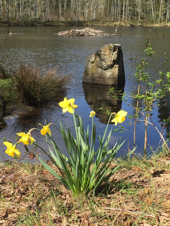 This is one of the few places on the island where you find willow trees, looking especially pretty this time of year with their new yellow leaves. Except, of course, the one on that bit of land in the middle of the pond that the beavers have taken out of commission. (Still have yet to see an actual beaver here, but their presence is unquestionable.)