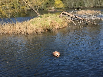 And, yes, that is Georgie in the distance swimming back to us. Joe can hurl the ball a lot further than I can.