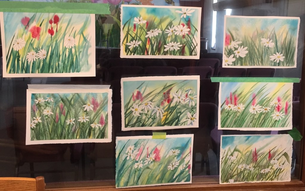 Because we’re finished before the end of the class, the instructor asks us to all tape our paintings up together.